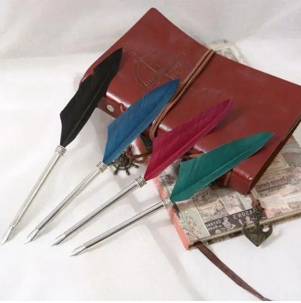 엔틱한 깃털 장식이 돋보이는 초록색 만년필입니다.
