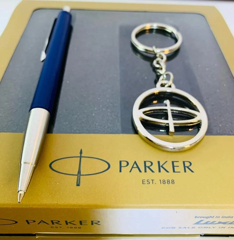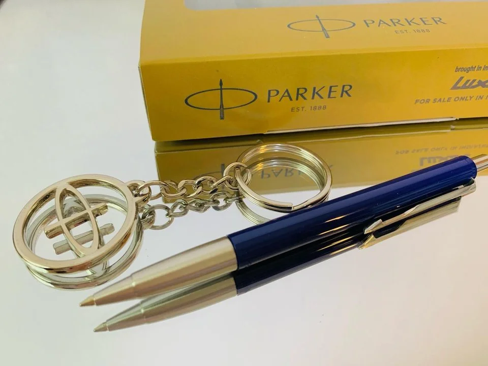 This authentic Parker pen set features an elegant dark navy body accented with gold-plated details.